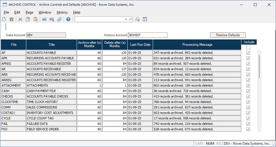 Processing Message Displays the results of the last archival or purge operation for this file, including the number of records archived and deleted. This provides a quick summary of the most recent processing activity.