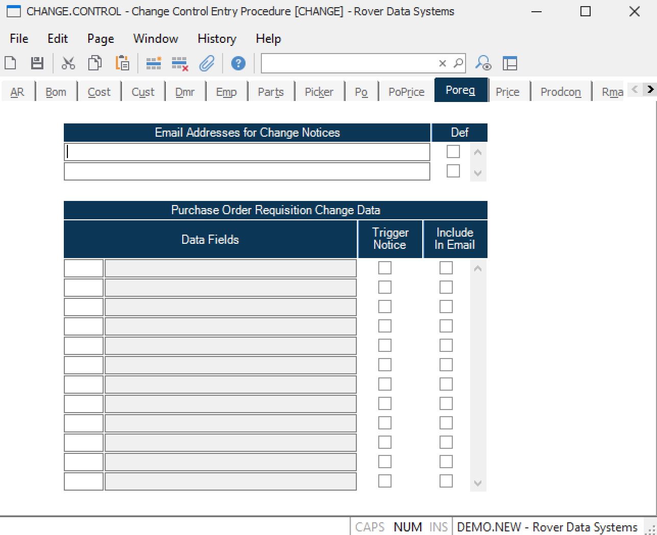 Poreq Field Number This is the field number in the POREQ file. Use the help option to load in selected fields that when changed will cause a change notice to be sent and/or will appear on the change notice itself. The fields that trigger a change notice will also be maintained in a POREQ change history log.