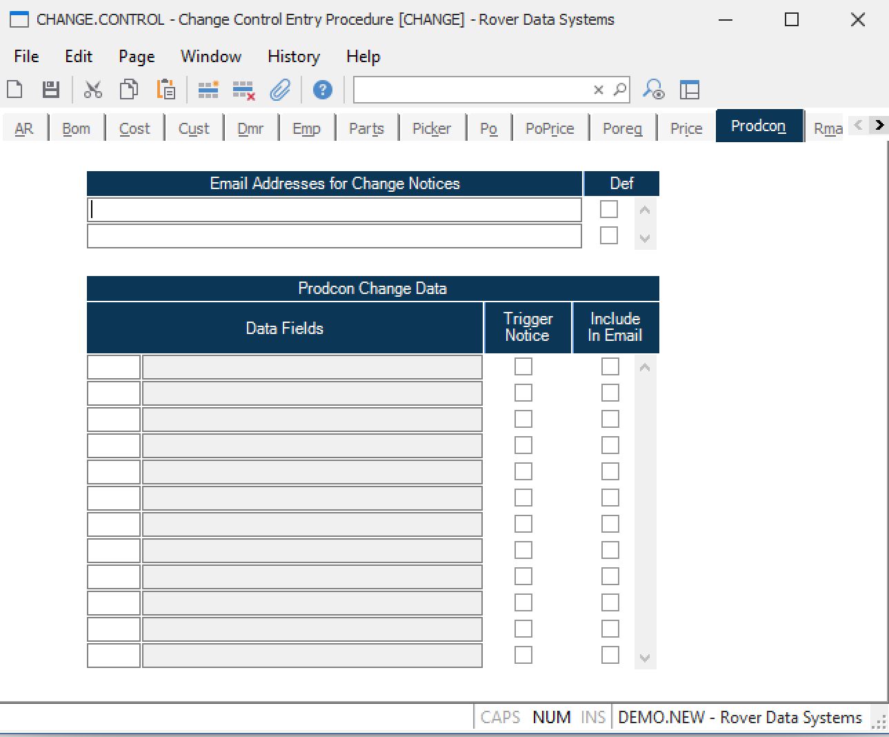 Trigger Change Notice? If checked, then a change to this field on a Prodcon record will cause a change notice to be sent and Prodcon history data to be stored indicating what changed.