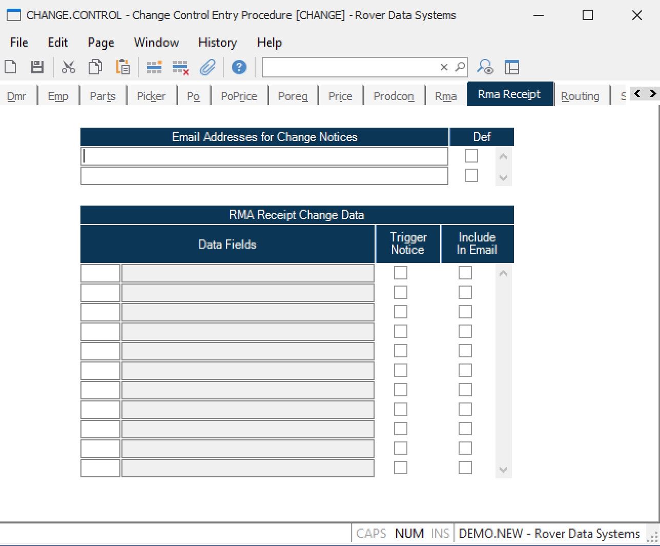 RMAREC Field Number This is the field number in the RMAREC file. Use the help option to load in selected fields that when changed will cause a change notice to be sent and/or will appear on the change notice itself. The fields that trigger a change notice will also be maintained in a RMA receipt change history log.