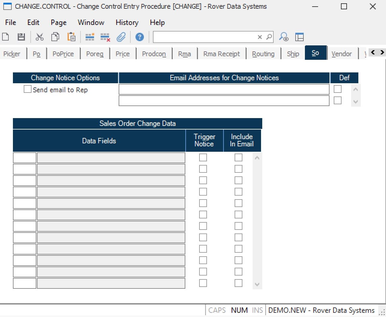 So Field Number This is the field number in the SO file. Use the help option to load in selected fields that when changed will cause a change notice to be sent and/or will appear on the change notice itself. The fields that trigger a change notice will also be maintained in a SO change history log.