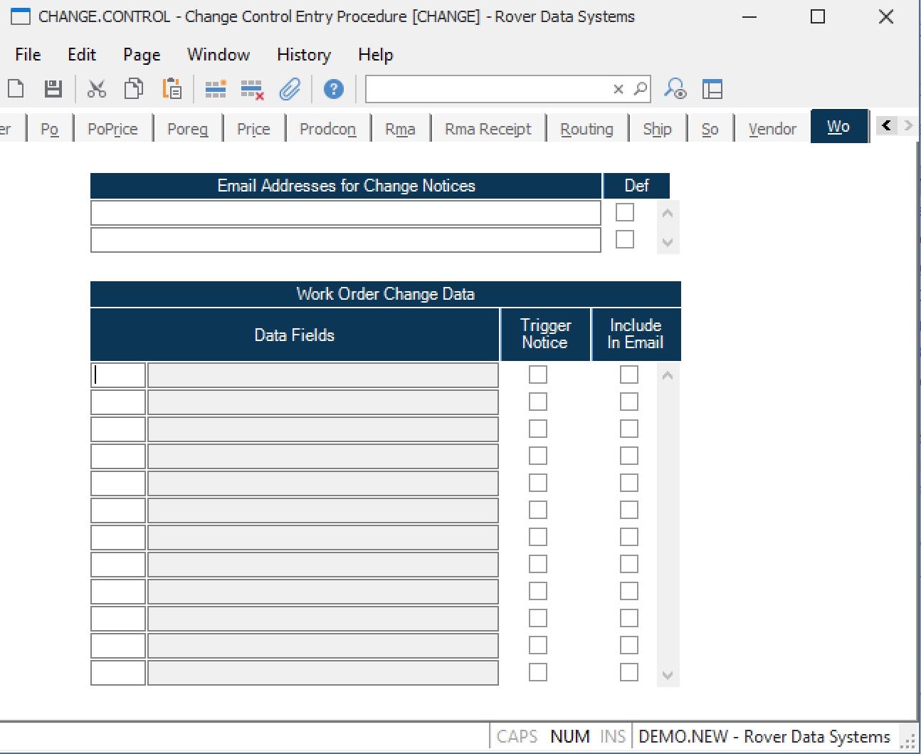 Wo Field Number This is the field number in the WO file. Use the help option to load in selected fields that when changed will cause a change notice to be sent and/or will appear on the change notice itself. The fields that trigger a change notice will also be maintained in a WO change history log.