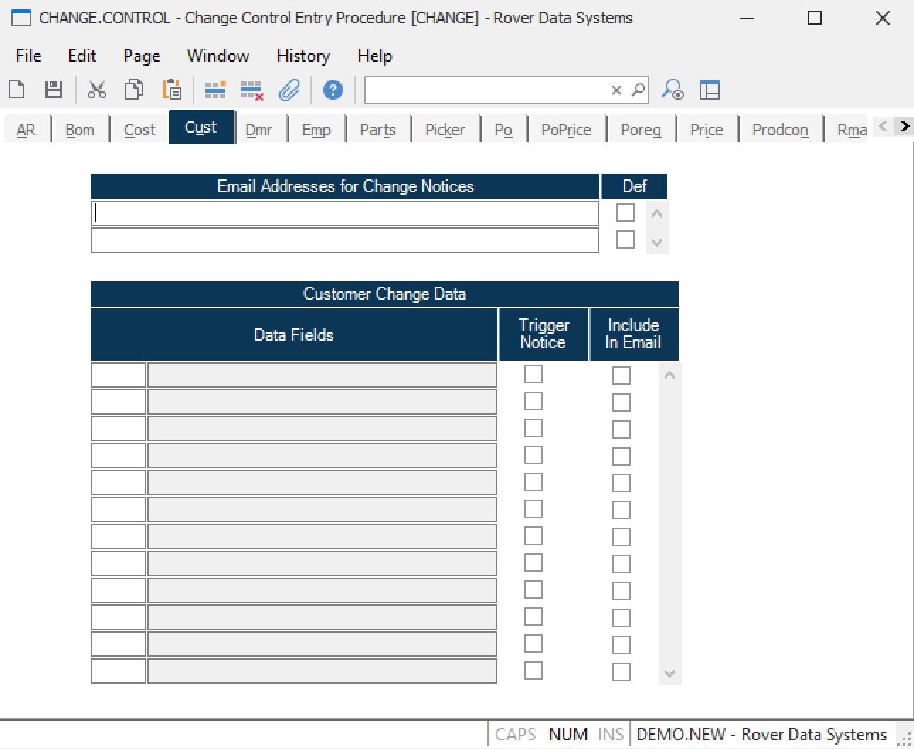 Cust Field Number This is the field number in the CUST file. Use the help option to load in selected fields that when changed will cause a change notice to be sent and/or will appear on the change notice itself. The fields that trigger a change notice will also be maintained in a customer change history log.