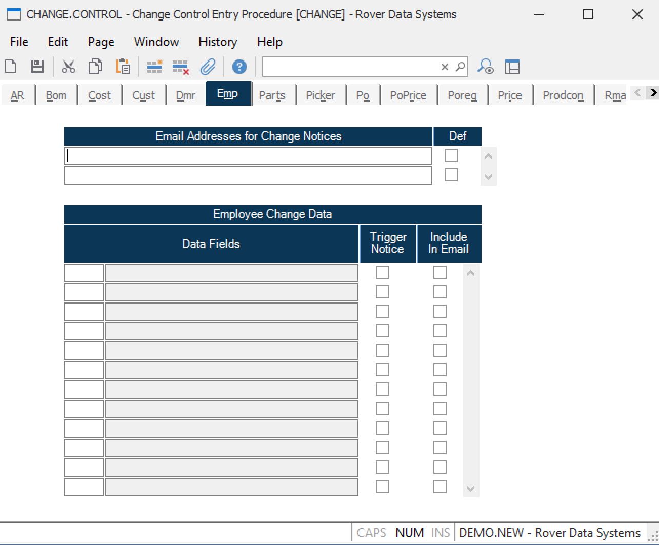 Emp Field Number This is the field number in the EMP file. Use the help option to load in selected fields that when changed will cause a change notice to be sent and/or will appear on the change notice itself. The fields that trigger a change notice will also be maintained in an employee change history log.