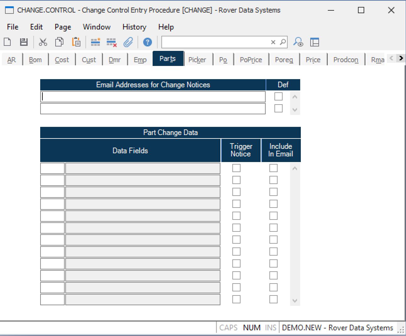Part Field Number This is the field number in the PARTS file. Use the help option to load in selected fields that when changed will cause a change notice to be sent and/or will appear on the change notice itself. The fields that trigger a change notice will also be maintained in a PARTS change history log.