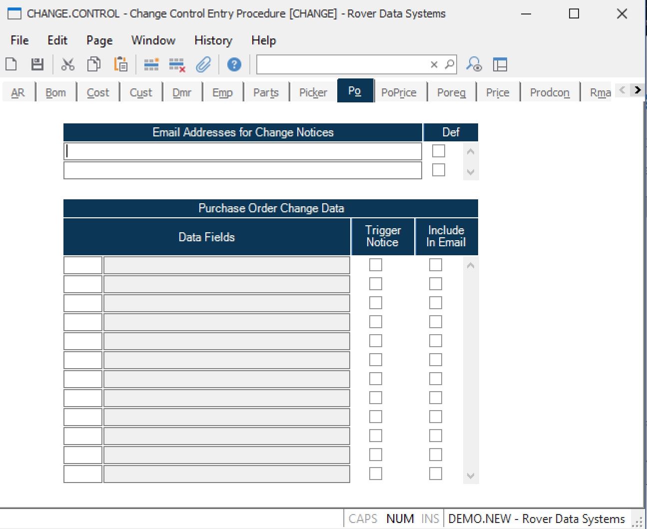 Po Field Number This is the field number in the PO file. Use the help option to load in selected fields that when changed will cause a change notice to be sent and/or will appear on the change notice itself. The fields that trigger a change notice will also be maintained in a PO change history log.