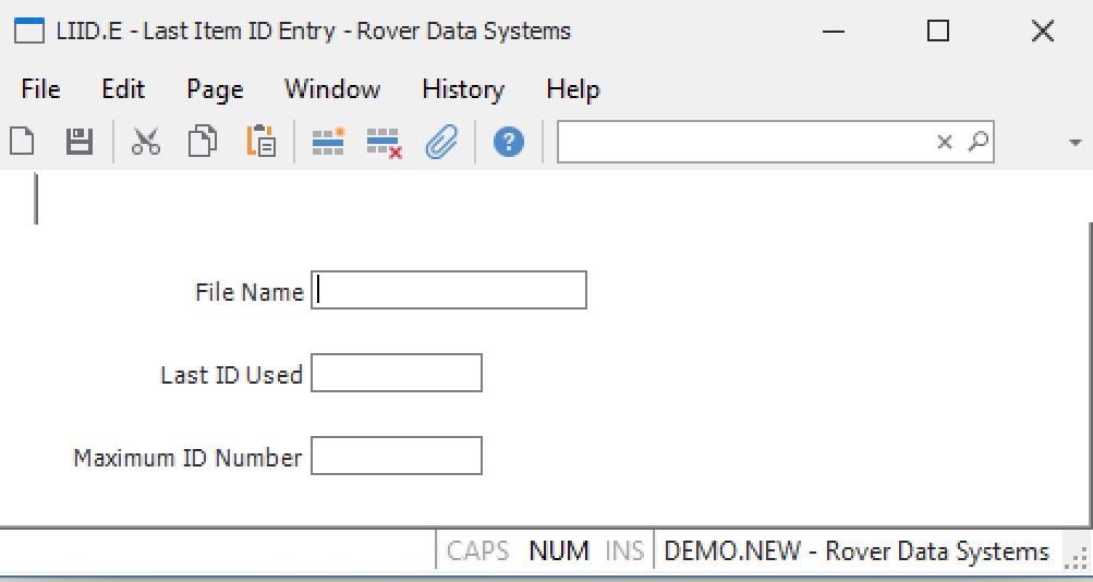Last ID Used This field contains the last sequential ID assigned to a record in the associated file. If you are setting up a new LIID record then you may set this field to one number less than the number you want to use as the first sequentially assigned ID in the file. For example, if you want the first number to be 1 then set this field to 0; set it to 99 if you want the first number to be 100 etc. You may also change the number on an existing LIID record but you should not set the number to a lower number unless you are sure that there are no existing records that may be overwritten when the system begins assigning record IDs.