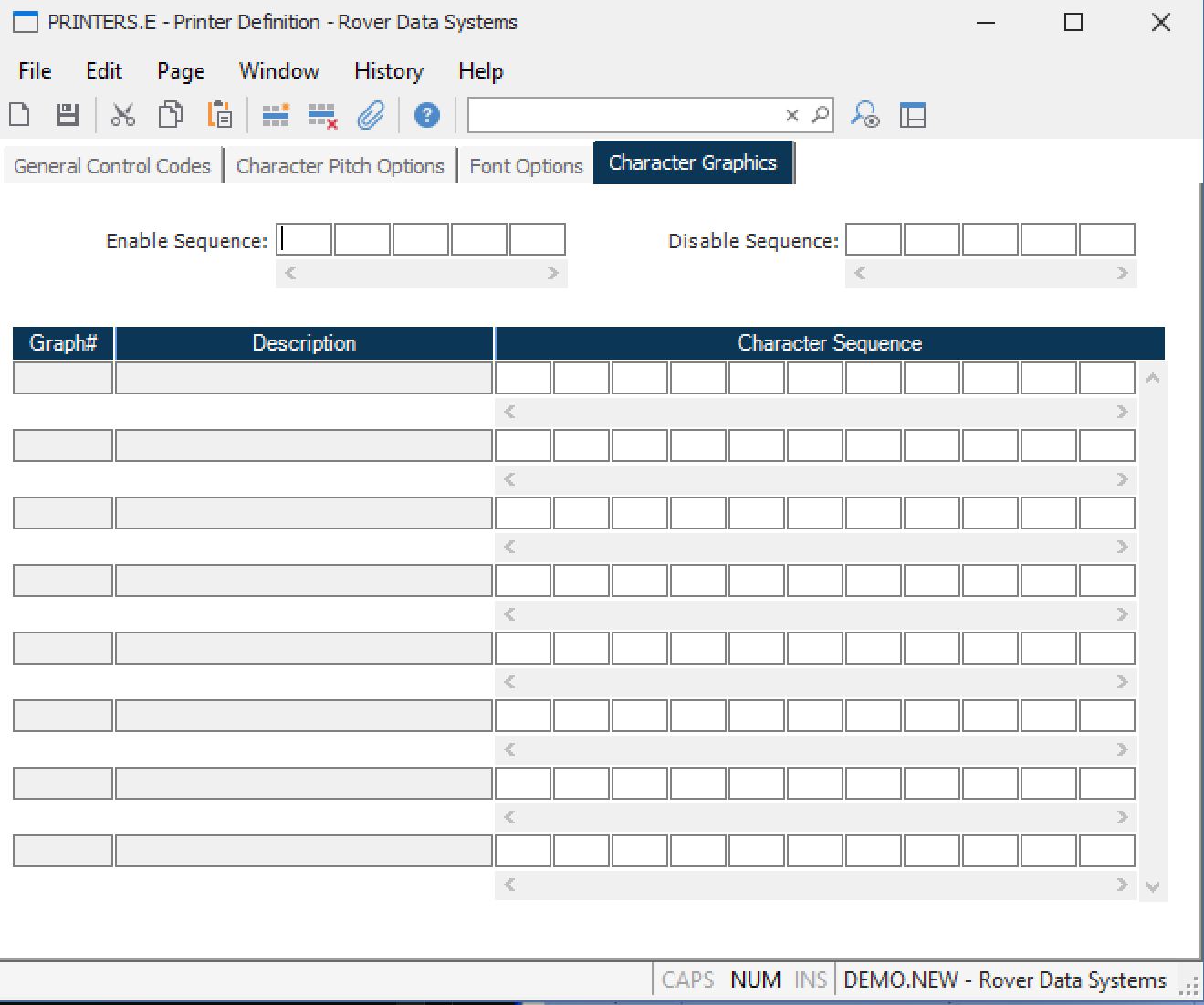 Char Graphics On Enter the decimal numbers which define each of the ASCII characters to be transmitted to the printer to enable character graphics printing.