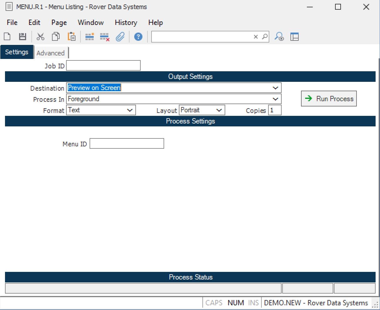 Menu ID Enter the name, or partial name, of the menu you wish to print. To print all menus on file, leave this field null. To print all menus for a specific module, you may enter the first part of the menu name (e.g. INV will print INV.M, INV.M1, INV.M2 and INV.M3).