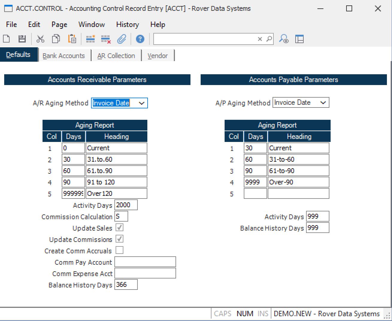 A/R Col 5 Days Enter the number of aging days, if required, for the fifth column (bucket) to appear on the aging report. If you wish the fifth column to show over 90 day items, enter "9999". If this field is left blank only 4 aging periods will appear on the report.
