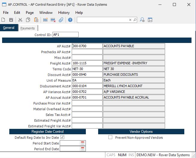 Control.ID The control id is the company code (as defined on screen 2 of CO.CONTROL) preceded by "AP". If you only have one company code the control id will automatically be inserted into this procedure for you. If you have multiple company codes you may select from a list of available companies or you may enter the id directly e.g. AP3. This record contains the default information used in the AP module by company code.