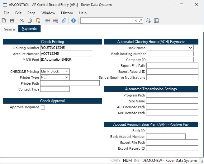 CHECKS.E Printing The CHECKS.E procedure provides the ability to create checks one at a time instead of through a check run. You have the option of printing the check automatically when the check is saved by setting the appropriate option in this field. If the field is left blank or is set to "Disabled" then users of CHECKS.E will not be presented with the option to print the check. To enable this option select either "Blank Stock" or "Pre-printed". Select blank stock when the checks your are printing on are blank and contain no formatting or company information. The CHECKS.F5 procedure will be invoked to print the check in this case. Select Pre-printed for check stock that is already formatted and contains company information and MICR codes. Note: This is not compatible with continous tractor feed forms used in impact printers. Also, you must setup a path to the pdf document that defined the check layout in FORM.CONTROL when using Blank Stock.