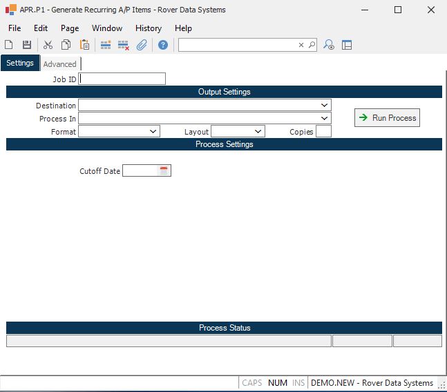 Cutoff Date Enter the date which will be compared to the dates contained in the recurring A/P records to select which items are to generate invoices.
