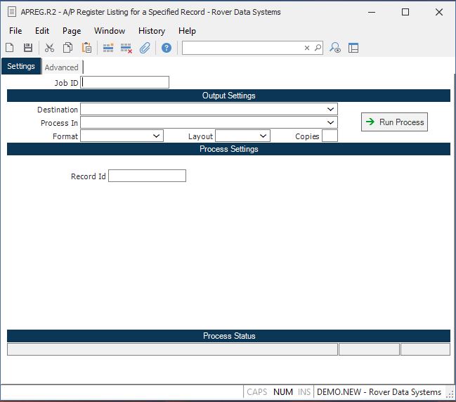 Record Id Enter the record ID for which you wish to list all AP Register records. Examples of record ids would be the check number or the a/p id which might be a receiver number (1348-2) or a misc. number (123) assigned by the system.