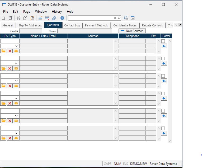 New Contact Click this button to create a new contact. This will launch the contact entry procedure ( CONTACT.E ) and add the ID of the new contact to the list of existing contacts for the customer. If a contact record already exists and you simply want to add it to the list enter contact id in the first open contact id field or enter a portion of the name to invoke a lookup.