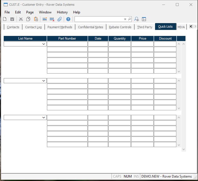 Quicklist Price This field represents that last price paid for the item by the customer. This will be the sales order price from the most recent sales order containing the associated part when using the SO.P6 procedure to load this information.