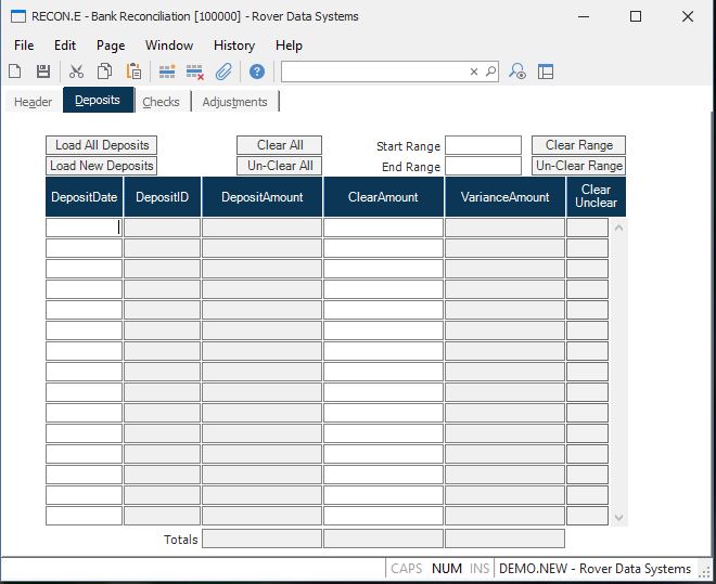 Load New Deposits Press this button to load in any deposits that have been created since the RECON record was last updated. The deposits that are loaded into this record for you come from the CASH records that have been created via CASH.E , CASH.E3 or CASH.E4 . This option will not over-write any deposit data that has already been entered into this procedure. This option is helpful when you are reconciling daily or weekly and not just at month end.