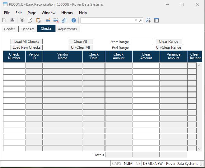 Load All Checks This button is used to load all uncleared checks up to the end date entered on the first tab. If checks have already been entered into the section below, pressing this button will over-write that data. If you only want to load in checks that have been entered since the RECON record was last updated, use the 'LOAD NEW CHECKS' button.