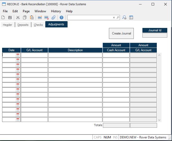Adj Date Enter the date for the adjustment to be entered. Entries made on this tab should reflect debits/credits that were referenced on the bank statement but were not entered into the system as a cash or check record. If, for example, the bank paid you interest on the account, you could either create a cash entry via CASH.E3 to reflect the deposit or you could create a manual journal entry via GLTRANS.E to track the deposit. If you create the cash entry, the deposit will be loaded into this record for you as deposit. If you create the journal entry, the deposit will not be loaded into this procedure for you and you will need to make an entry on the adjustment tab in order to reconcile the bank statement.