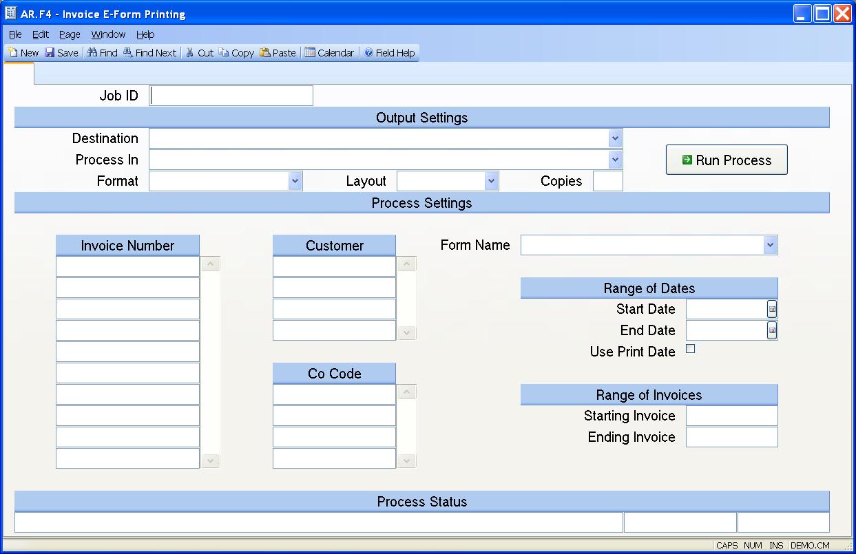 Invoice Number Enter all of the invoices you want to have printed. If you wish to print all invoices not yet printed, then leave this and all other fields null. Otherwise, you may leave this field null and select a range of dates or invoices to print.