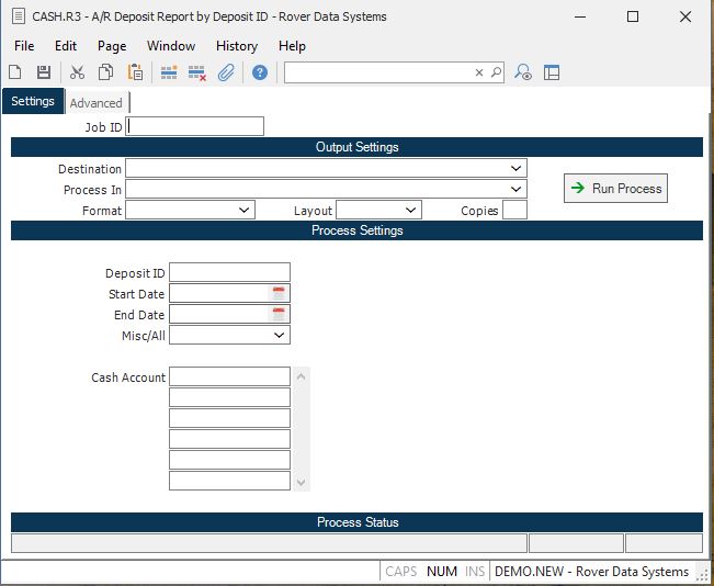 Deposit ID Enter the deposit ID for which you wish to select cash records. This ID was entered in the cash entry screen(s).