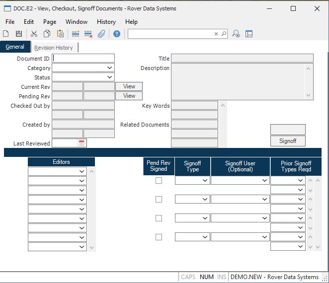 ID Enter a document ID to edit an existing document. New documents may not be created with this procedure. All data in this screen is view only. It is mostly for viewing document information, checking out and signing off documents.