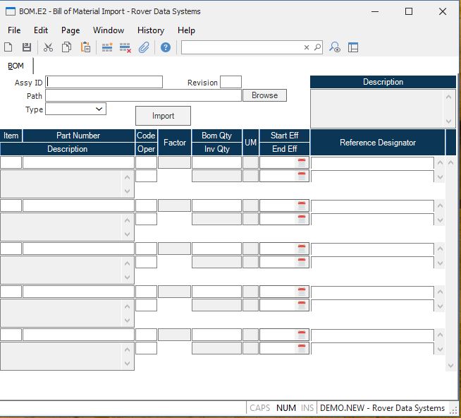 Path Enter the path to the record containing the import data for the BOM. This is the path to a Windows file, as seen from the client PC.