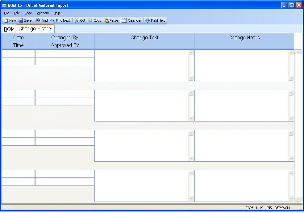Change Date The date the BOM record was changed. This is only stored if one of two conditions are met: 1) The parameters are set in CHANGE.CONTROL and a change was made that met the criteria for storing change history or 2) Change notes were entered by the user. This field is system controlled.