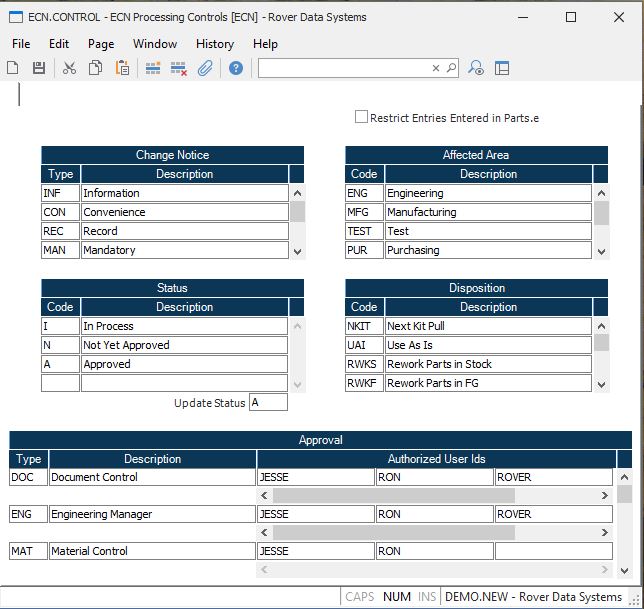 Update Status If you want the system to automatically update the status of an ECN when it is posted to the Parts Master with ECN.P1 , then enter the status to be used in this field. If left blank then the ECN status will not be changed.