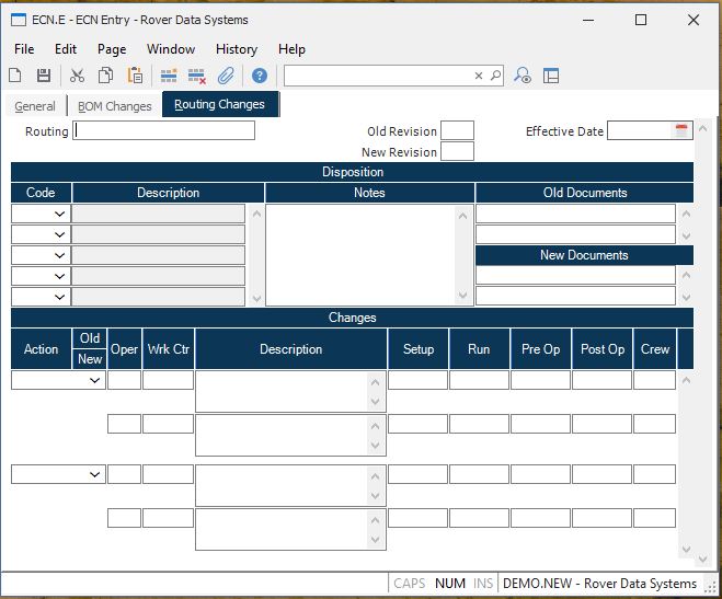 Old Revision Enter the revision of the associated routing before the change on the ECN is enacted. The current revision from the routing will be loaded into this field, and can be changed if required.