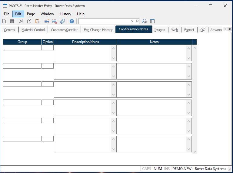 Config Notes Configuration notes are normally collected as part of the configuration process and loaded when the parts record is created. They may be used for manual notation as well.