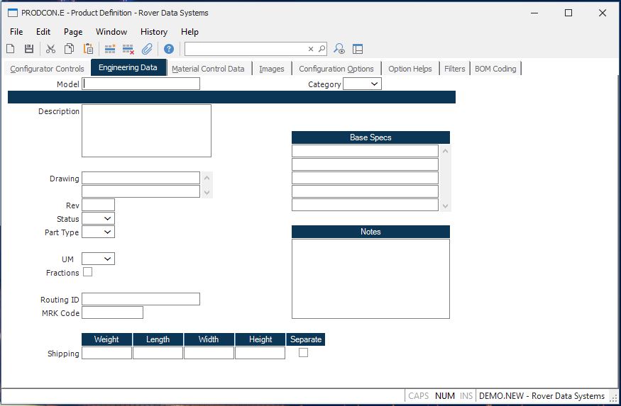 Model Enter the model number associated with the product being defined. The entry in this field will be stored in the Model Number field of the Parts Master records created when an item is configured. The system will default the Configuration ID for new records.