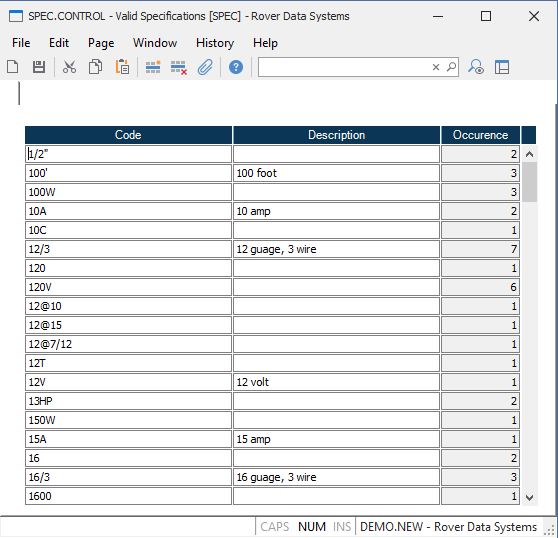 Code Enter each of the valid specification codes that may be entered into the specs field of the parts master record. If you leave this field blank then any entry will be accepted in the parts master entry procedure.