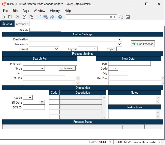 ECN.ID If this change is associated with an existing Engineering Change Notice, then you may specify the ECN number in this field. If a valid ECN number is entered, this procedure will not make the changes to the bills of material directly. It will instead load the assembly numbers matching the selection criteria, and the proposed changes into the ECN record. You may then adjust these entries with ECN.E if desired, and use the ECN.P1 procedure to actually post the updates. If an ECN number is not specified, this procedure will make the changes directly to the bills of material.