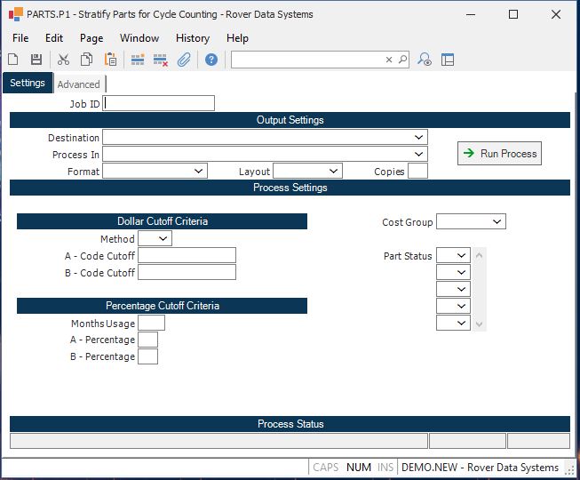 "A" Percentage Cutoff Enter the percentage of parts that should become "A". For example, if you enter 20, then the top 20% of parts ranked by usage & cost will become "A" parts.