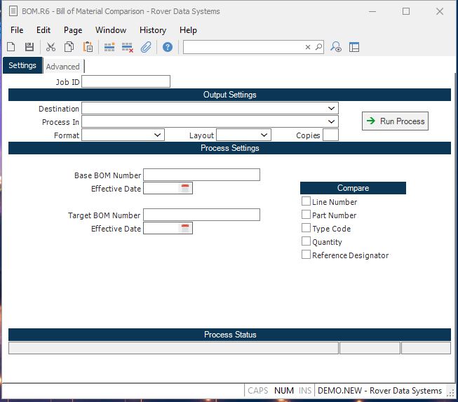 Second BOM Number Enter the number of the second bill of material to be used in the comparison. You may also enter a model number, category or manufacturer part. If you want to coompare the same bill of material with different effectivity dates then enter the same bill of material number in both the first and second BOM number fields.