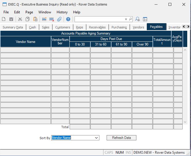 Refresh Data Clicking this button will cause the aging to be sorted by vendor name.