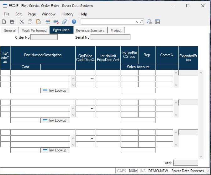 Part No Enter the part numbers used in performing the service. You may leave this field blank and describe the materials used if there is no part number used to define the item, however there will be no cost of sales generated for the item or inventory reduction.