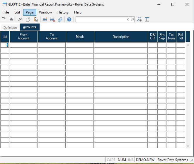 To Account If the value for the line is to be based on a range of account numbers, enter the ending account number in this field. If the line is only to reference one account number then enter the account number in the "From Account" field and leave this field blank. If you want all of the accounts in the range to be printed as individual lines, you may do so by entering the letter "E" (expand) in the "Prn Sup" field.