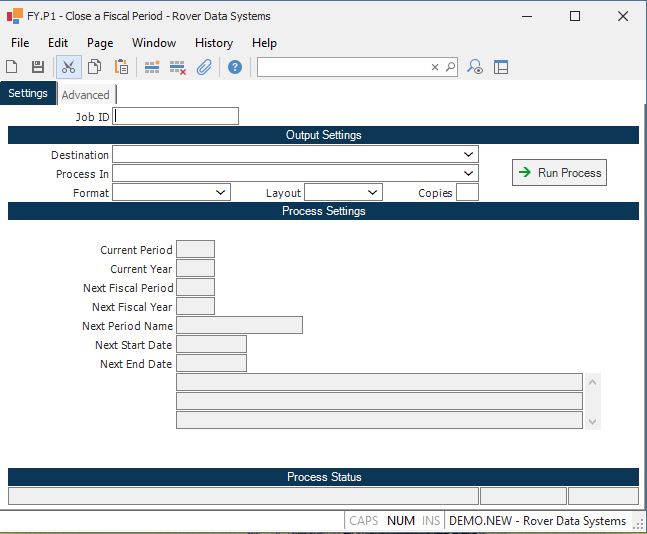 Next fiscal period The fiscal period which will become the new, current period after this period end process is run. This is shown in order to make sure you are certain this is what you want to do. This field cannot be changed in this procedure.