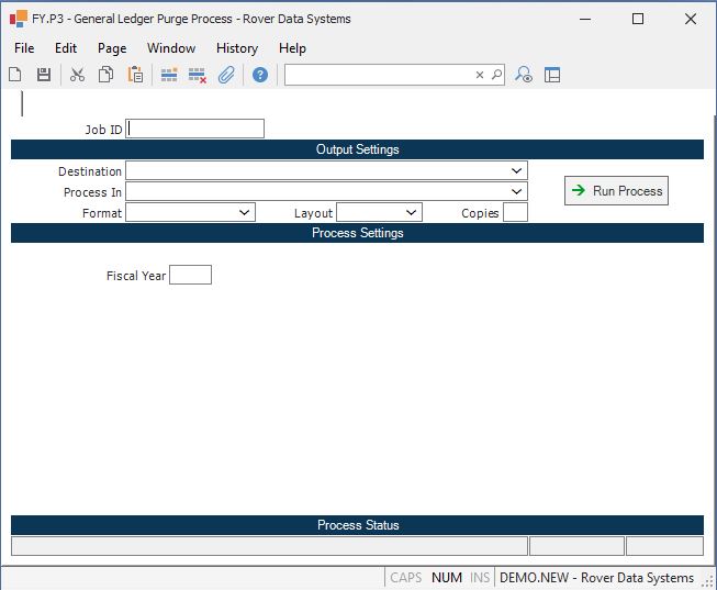 Fiscal Year Enter the fiscal year for which you wish to purge the records. All records in the GLBAL file which fall in the selected fiscal year will be deleted, as well as the FY record for that year.