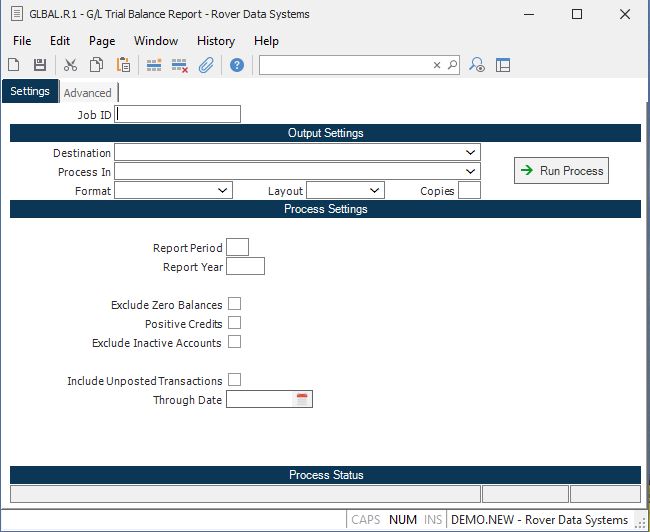 Report Period Enter the fiscal period for which you wish to run the trial balance. This field will default to the report period which is in the GL.CCONTROL record.