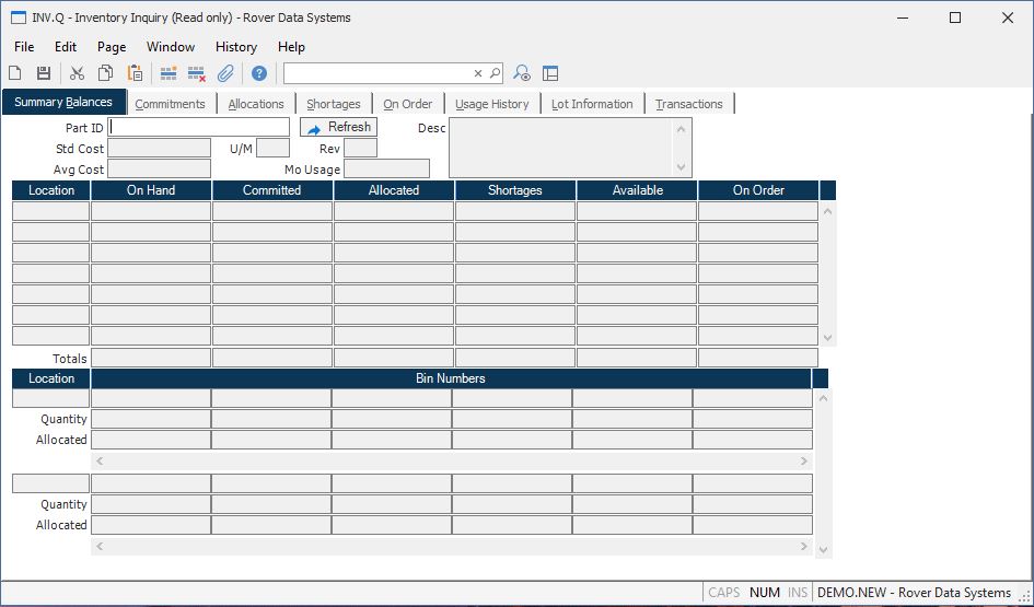 Available Contains the number of parts that are not committed and/or allocated. This figure represents the on-hand balance minus the greater of allocations or commitments. Please note that the allocated quantity can be a subset of the committed quantity. For example, you may have placed an order for 10 pieces of a part and selected to commit that quantity. At this point, 10 pieces will show in the committed column. If you then create a shipper in a "N" (new) status for the sales order for those same 10 pieces, you will see 10 pieces in the alllocated column. The available calculation will only be reduced the quantity on hand by 10 pieces.