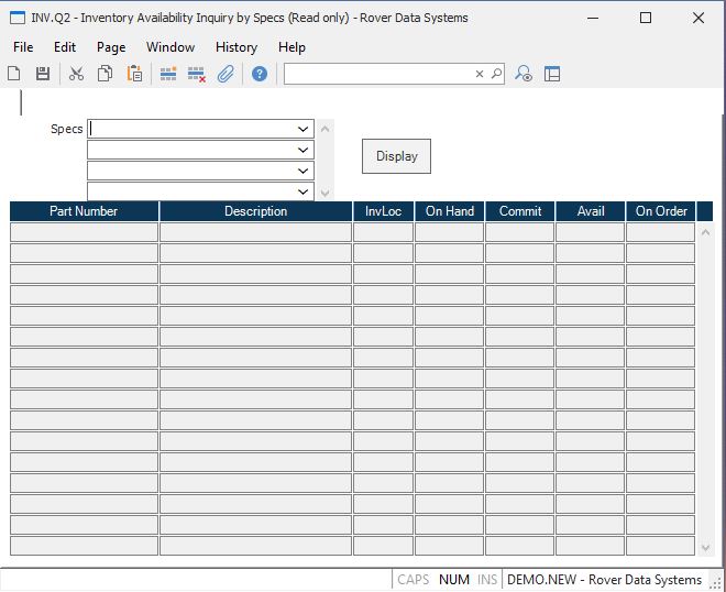 Specs Enter the specifications for which part and inventory information will be retrieved. Any part numbers with and inventory status (INV record) and which match all specs entered will be displayed.