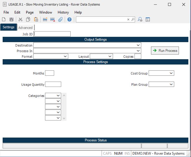 Months Enter the number of months of usage you want to include in determining if an item is slow moving. For example, if you enter "6" the most recent six months usage history will be totaled to determine if the item qualifies as a slow moving part.