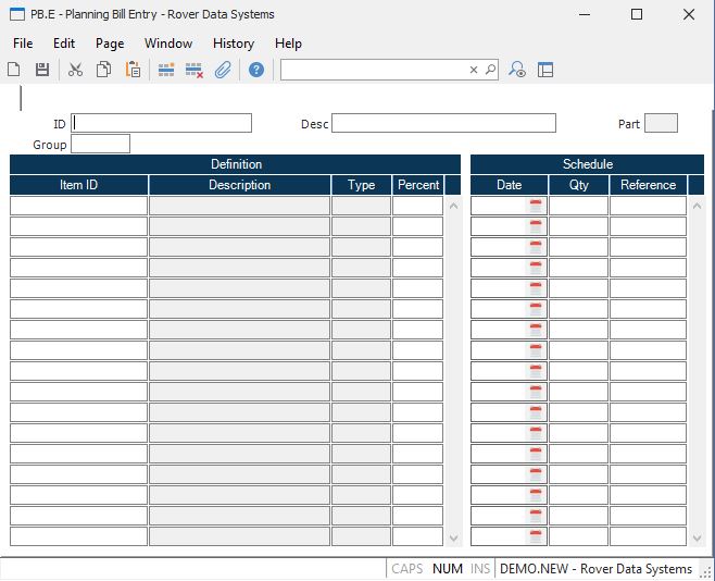 PB.ID Enter the identification of the planning bill you want to add or update. Planning bill IDs are user defined and may represent a logical product group or options package. If you want the system to make use of the planning bills in the MPS.P1 process then the planning bill IDs you want used must be defined on the parts master as MPS items. Please note that this not required if you are only using the planning bills as a means to load the forecast or MPS directly for the items defined within each planning bill. In this case you are only concerned with the items in the planning bill and not the planning bill itself.