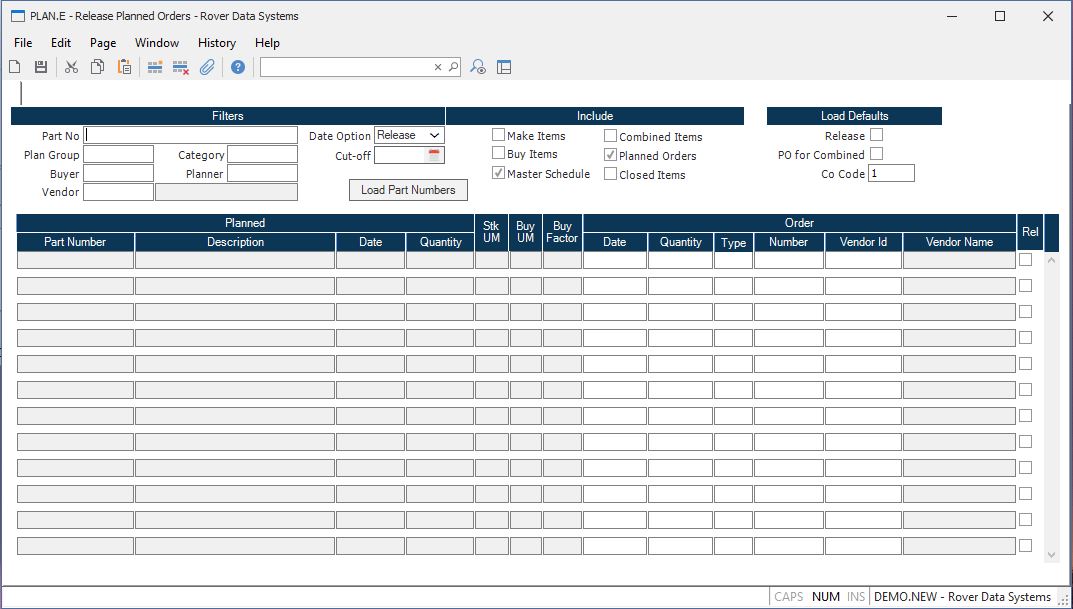** &Load Part Numbers ** Press this button to refresh the planned order data below based on the criteria entered at the top of the screen. Any data entered below will be overlayed.