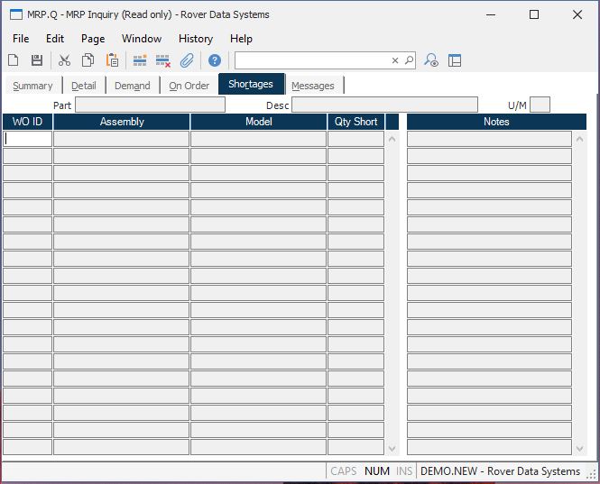 Work Order Number Shows all of the work orders which have a shortage of the part and the quantity short.