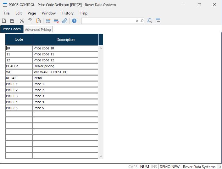 Code Enter each of the price codes that are to be available in the system. Price code entry fields in procedures such as CUST.E and SO.E will validate the entries against this list.