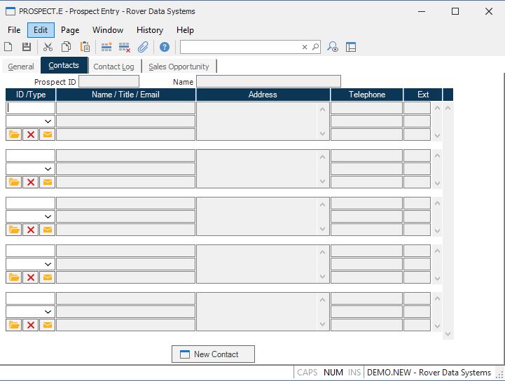 New Contact Click this button to create a new contact. This will launch the contact entry procedure ( CONTACT.E ) and add the ID of the new contact to the list of existing contacts for the customer. If a contact record already exists and you simply want to add it to the list enter contact id in the first open contact id field or enter a portion of the name to invoke a lookup.